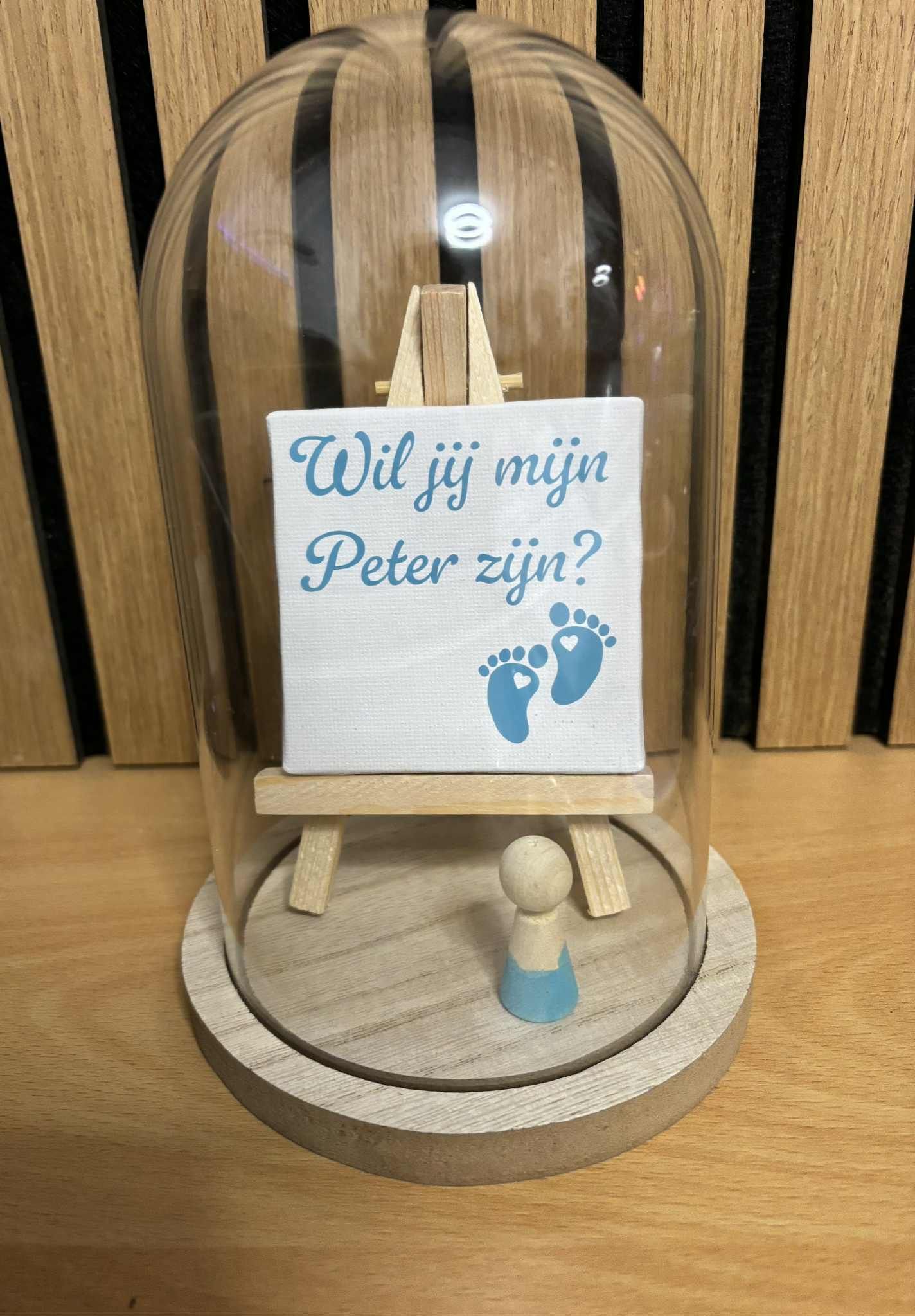 Een onvergetelijke manier om een heel bijzondere vraag te stellen… Deze unieke stolp is met zorg samengesteld en bedrukt op canvas met de tekst : ” Wil je mijn peter zijn?” Een dierbare boodschap verpakt in een stijlvol en liefdevol geheel. De stolp bevat een bijpassend houten popje . Alles samen vormt dit een waardevol aandenken dat zeker een mooi plekje krijgt.